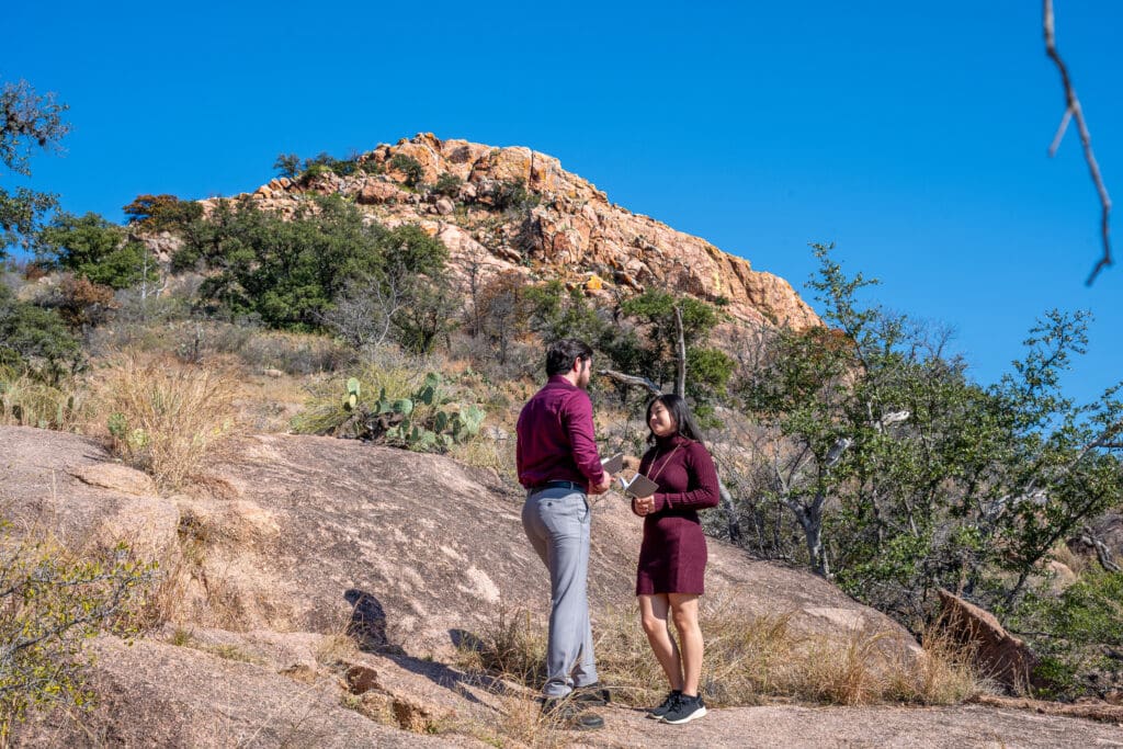 While the summit is the most well known location, it is far from the only beautiful place to elope withing the park. Enchanted Rock offers many lesser known spots that provide incredible views with the massive granite dome as your backdrop. Shaded areas, rocky outcroppings, and quieter trails can create a more intimate setting while still showcasing the iconic landscape. These locations are perfect for couples who want stunning scenery without hiking all the way to the top or competing with summit crowds.