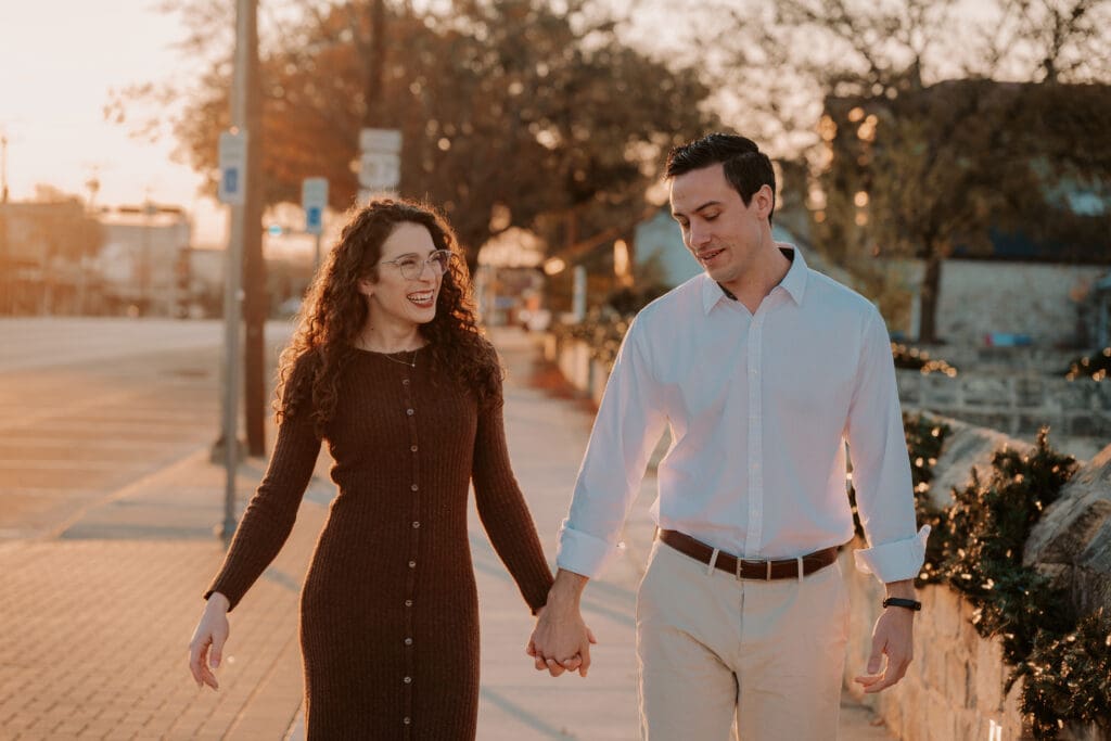 Kayley and Matt’s engagement session took place in the quiet, early morning hours of downtown Fredericksburg, Texas, when the streets are calm, storefronts are just beginning to open, and the town feels especially timeless. Choosing a weekday morning allowed us to explore at an unhurried pace, creating a relaxed atmosphere where their connection could naturally shine.
